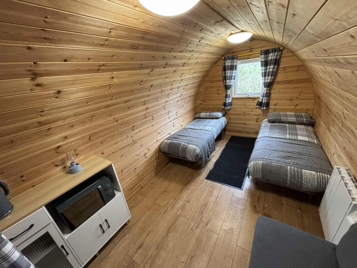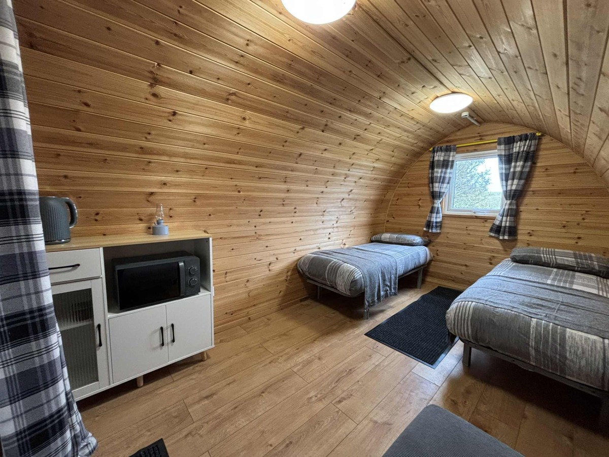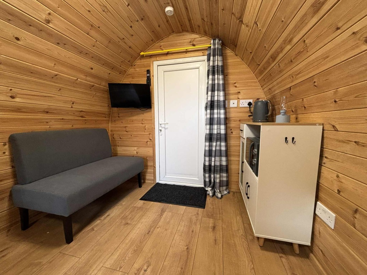 Each pod is thoughtfully designed for comfort and comes with heating, a TV, cozy beds, and essential furnishings, making it a perfect all-season escape. Step outside to take in panoramic views, explore walking trails, or simply relax with a coffee in the fresh country air.