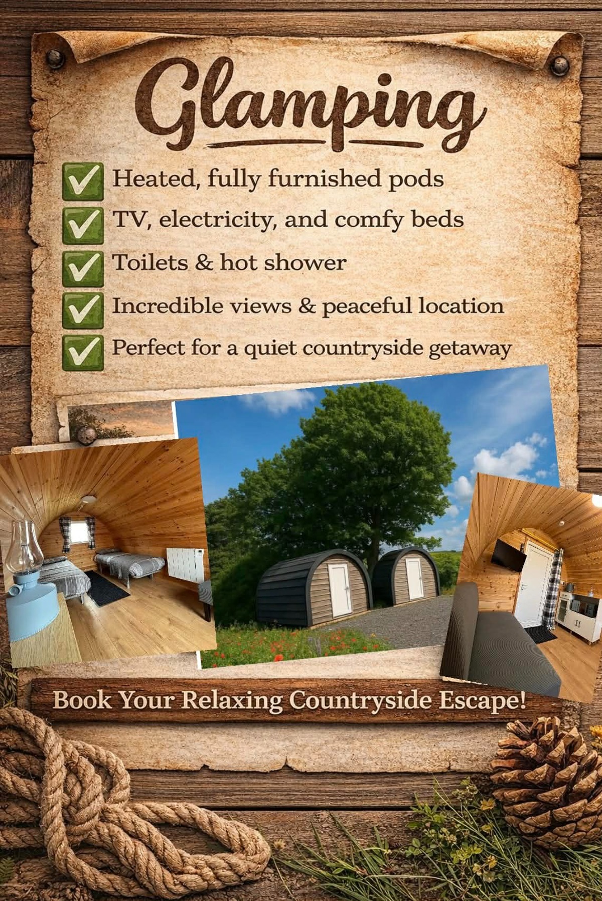 Nestled in the heart of the countryside, our small rustic campsite offers a peaceful retreat with all the comforts of home. With just a few fully equipped glamping pods, you’ll enjoy space, serenity, and unforgettable views — without sacrificing warmth or convenience.
